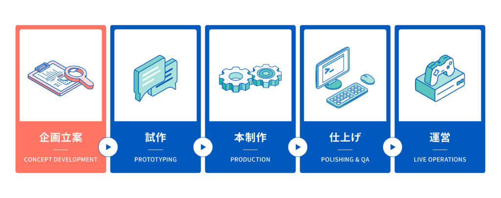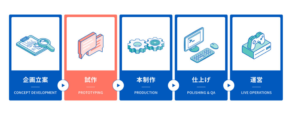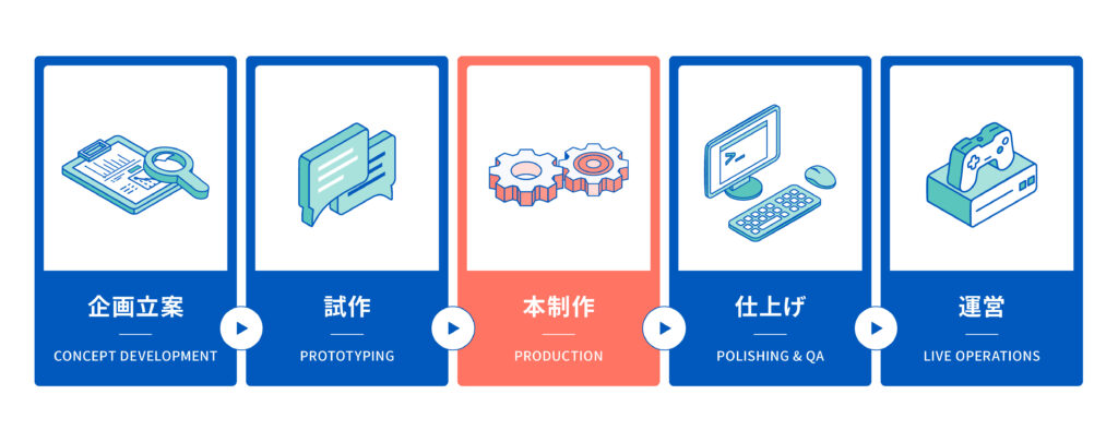 主要機能を一通り体験できる状態を作り、全体の完成度やシステムのつながり、クオリティラインを検証します。問題点を抽出して本制作を調整します。バーティカルスライスが完成すれば、それを基準に量産の作業を行い、ゲームを完成させていきます。