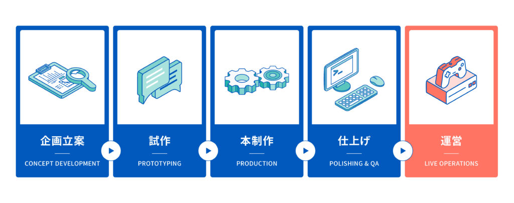 それでは、これだけ多くの各職種・各部署の人たちは、どのように連携してゲームを作り、これを運営しているのでしょうか?実際に出来上がるまでの大きな流れを確認してみましょう。